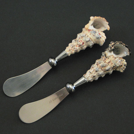 Set of two Stainless steel Spreaders with Knobby Cerithium Natural Shell Handles. Spreaders come in high-end gift box and are approximately 6" long.