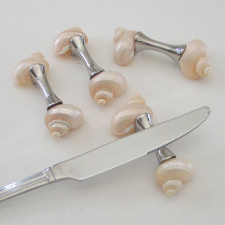 Set of four Knifes Rest with Natural Pearled Turbo Marmoratus Shells. Knifes Rest are approximately 4" long and are packed in high-end gift box.